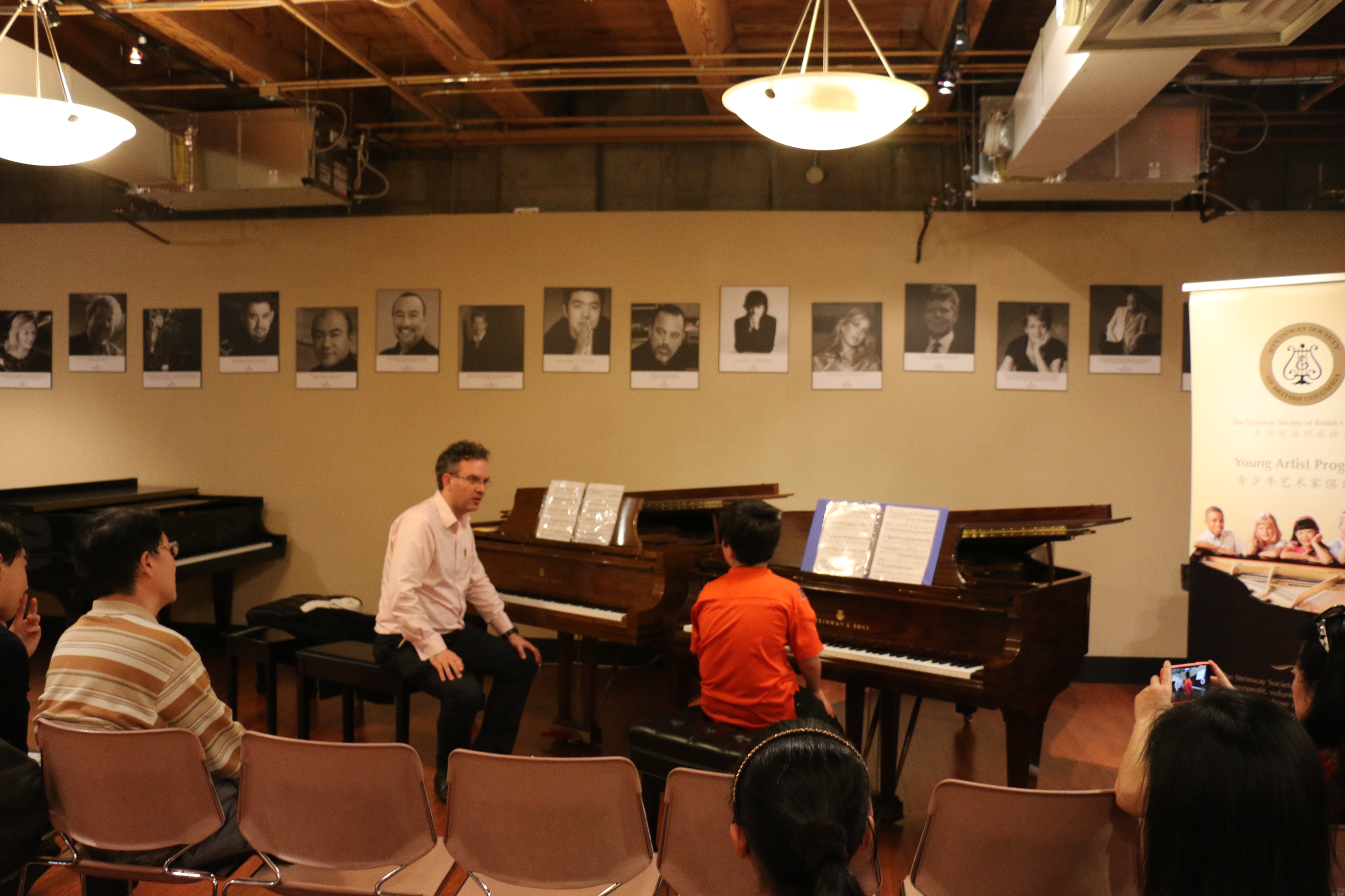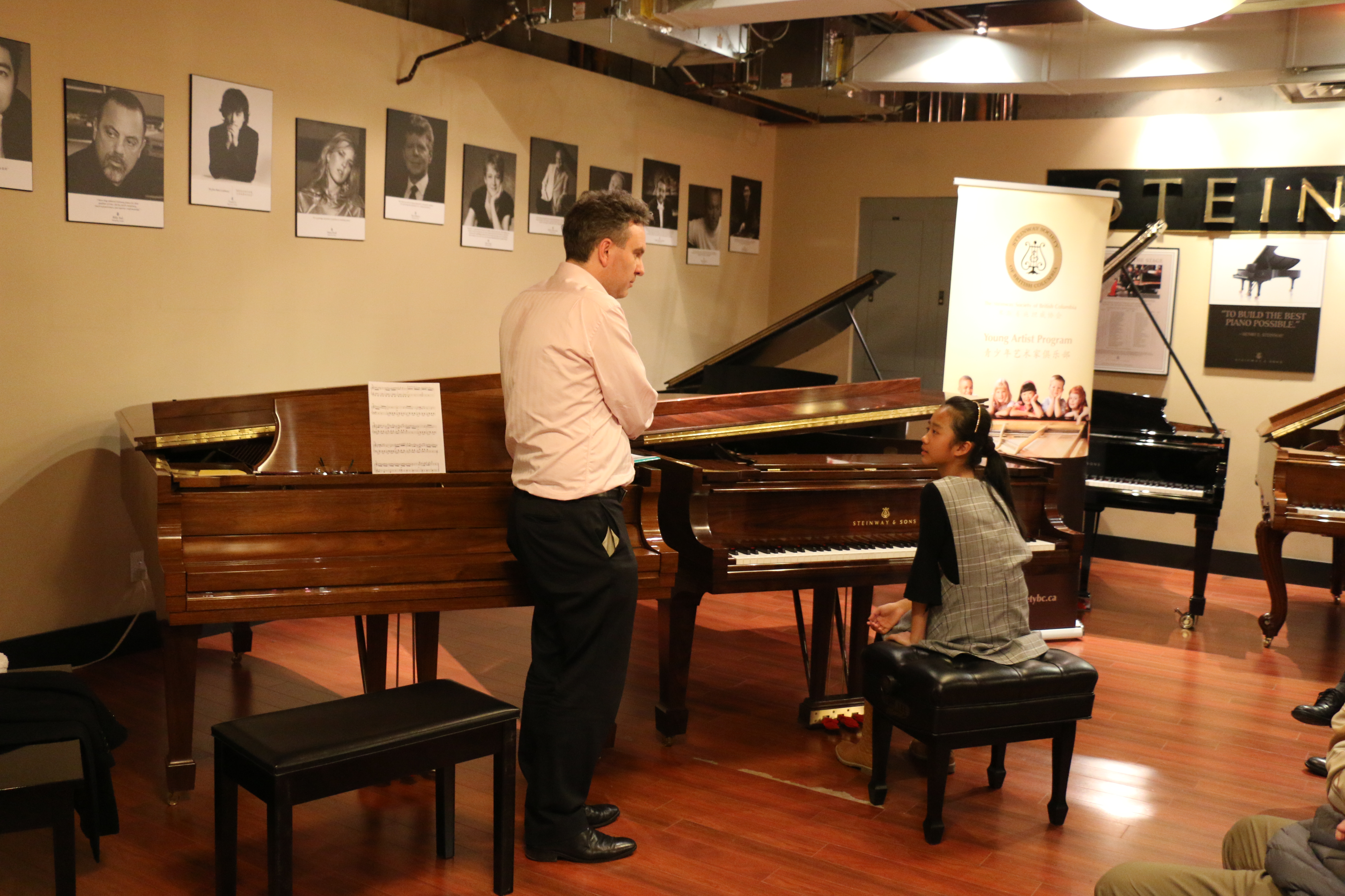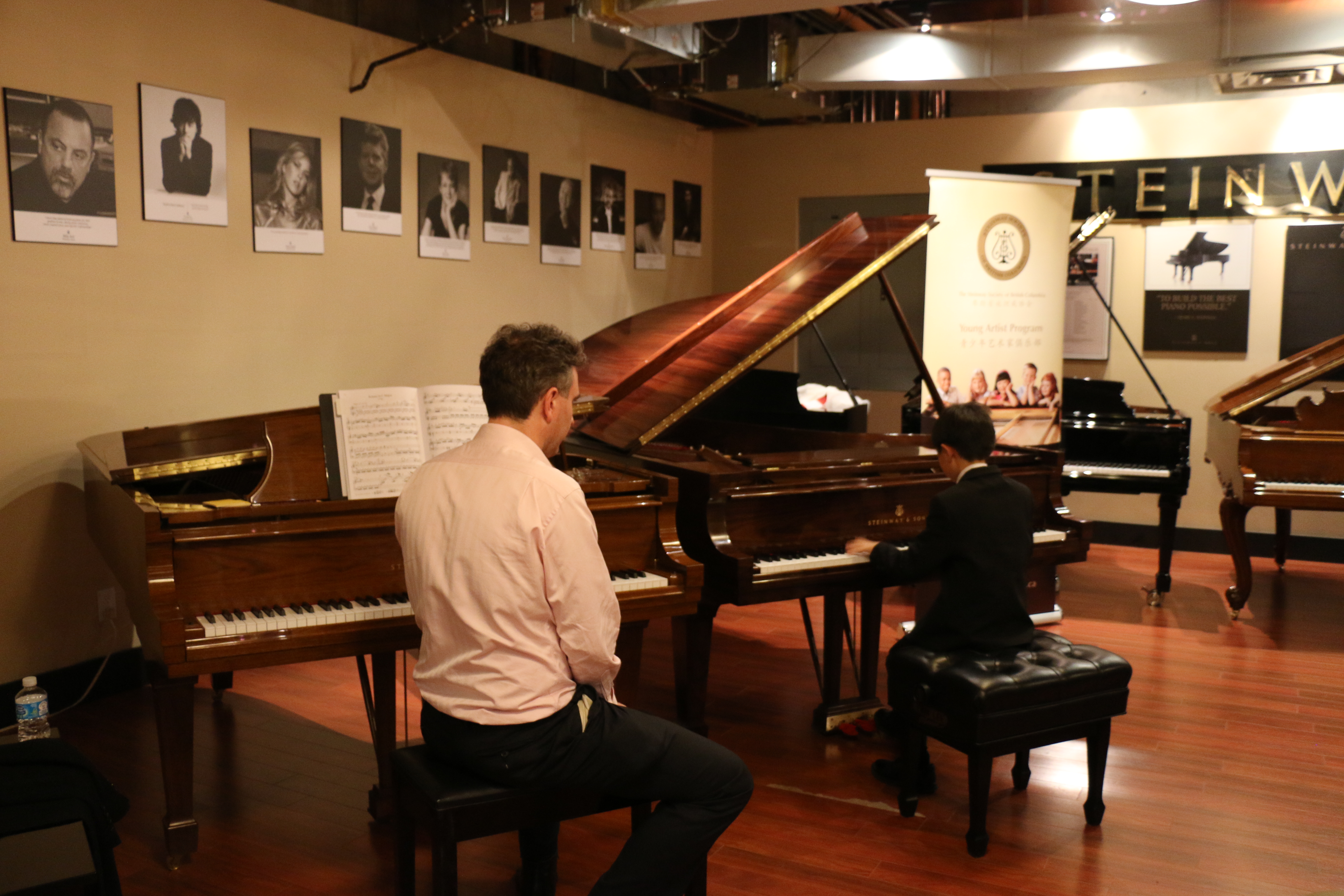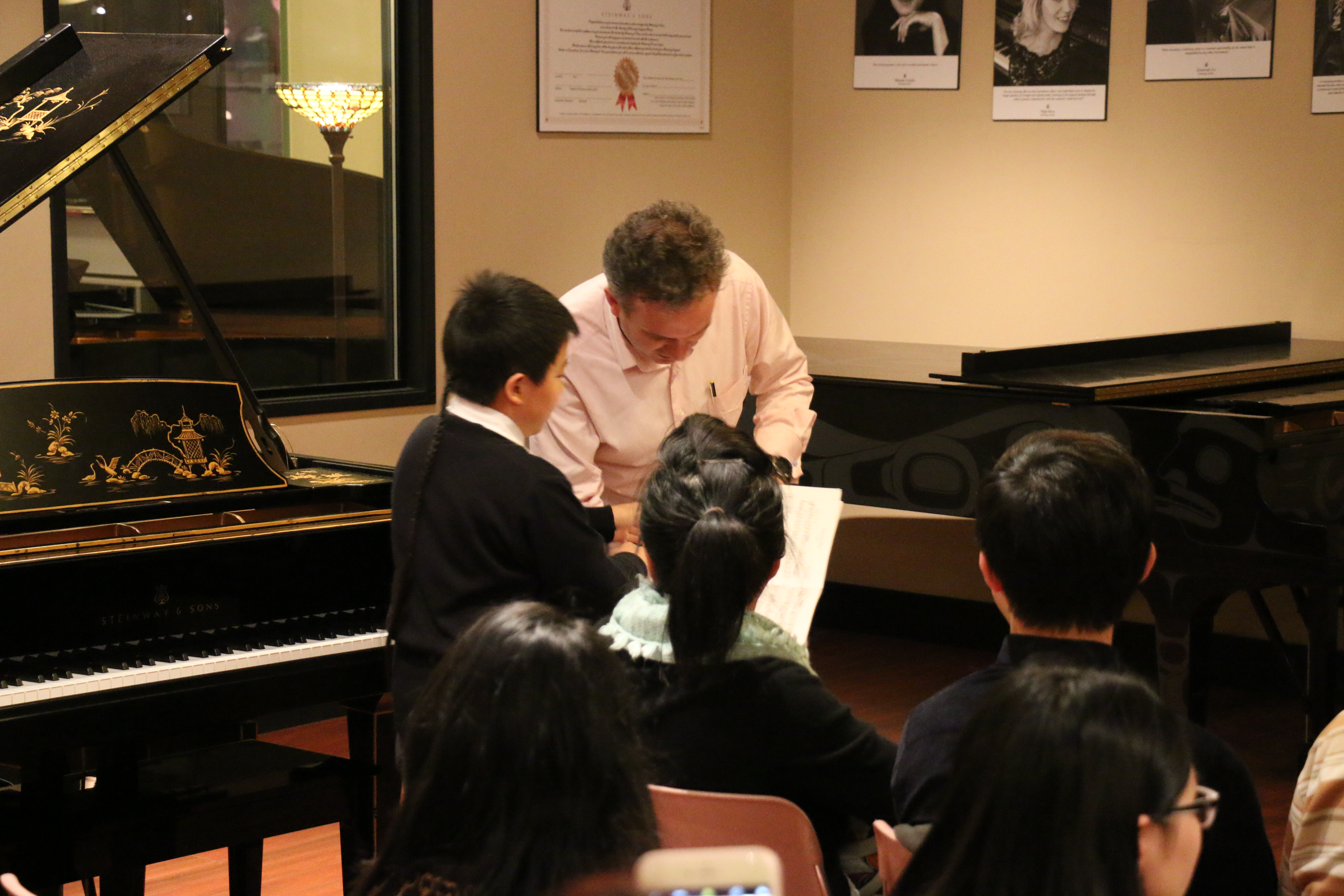 Our society could not agree more with this beautiful sentiment from Steinway Artist James Brawn. On Tuesday, November 8th, members of our Young Artist Club were givenĀ a private master class with James, a man who forged his own musical path of discovery and can trace his pedagogical lineage back to Beethoven, Chopin, Liszt and Clara Schumann. Phoebe, Bing Yi, Amy, Alize, Robbie, Paul and Daniel all performed beautiful classical works ranging from Mozart to Rachmaninoff. James provided thoughtful insight on each performance, coaching the students through the more difficult performance elements in each piece. During one session, James instructed the student to define the phrasing more prominently by putting “energy in the ends of your fingertips.” He later stressed the importance of playing in time by advising the students to “always use a metronome, whether you are a professional or a young student.”